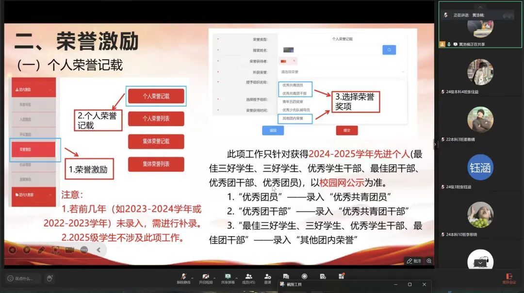 培训重点讲解了智慧团建系统中“激励管理”模块的操作规范,包括评议激励、荣誉激励、机会激励、发展激励。培训中,主持人结合实例逐步演示系统操作流程,并对常见问题与易错环节作了重点提示。还设置了答疑交流环节,确保参会团干部理解掌握相关要求。